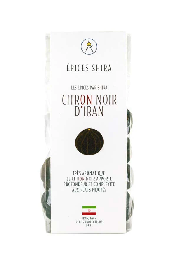 Nos citrons noirs proviennent de Fars, une province du sud-ouest de l’Iran. Cet ingrédient, très courant dans la cuisine iranienne, est au départ un citron vert que l’on a fait blanchir quelques minutes dans l’eau salée, puis sécher au soleil plusieurs jours jusqu’à ce qu’il devienne sec, léger et friable. Durant le séchage, le parfum du citron évolue et une grande partie de son acidité est remplacée par un goût caramélisé, profond avec de petites notes d’amertume venant de la peau du citron. Un vrai concentré d’umami !
