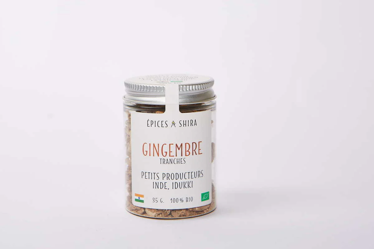 Notre gingembre biologique provient de petites fermes traditionnelles du Kerala, en Inde où polyculture et biodiversité sont règle d’or. Ce gingembre indien exhale une étonnante odeur de sucre et de pain d’épices qui évoque les marchés de Noël et les soirées d’hiver à côté du sapin. Son goût est chaud, légèrement piquant avec des notes camphrées. Les rhizomes sont cueillis à maturité après avoir passé 10 mois sous terre. Ils sont blanchis, pelés pour ôter l’amertume que l’on retrouve dans tous les gingembres, tranchés et séchés au soleil.