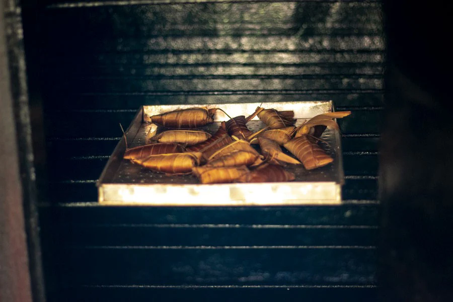 Le sel est ensuite tassé dans des ballotins de feuilles de cocotier fraîches qui sont remis à fumer une 3ème fois. Cette dernière opération permet d'imprégner le sel du tanin présent dans les feuilles de cocotier, lui conférant ainsi une intensité exceptionnelle.