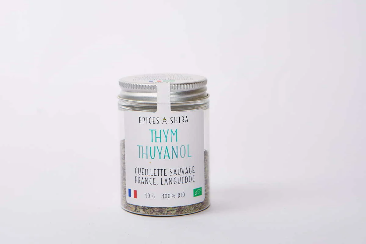 La cueillette du thym se fait dans le Languedoc, à la lisière des Cévennes. Nous proposons une sélection de 5 variétés de thym sauvages et biologiques d’une qualité exceptionnelle et dont les parfums sont tous étonnamment différents. Le thym thuyanol est un thym très frais, mentholé avec des notes d’eucalyptus et de mandarine.